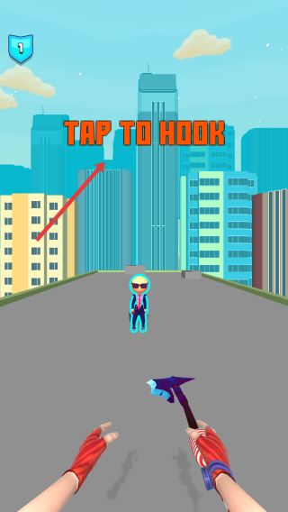 1、操作准备:进入关卡,屏幕显示“TAP TO HOOK”,点击屏幕发射钩子,瞄准目标(如敌人)。
