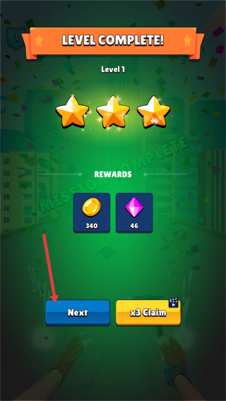 3、结算推进:通关后显示“LEVEL COMPLETE!”,获取金币、钻石奖励,点击“Next”进入下一关,持续推进游戏进度。