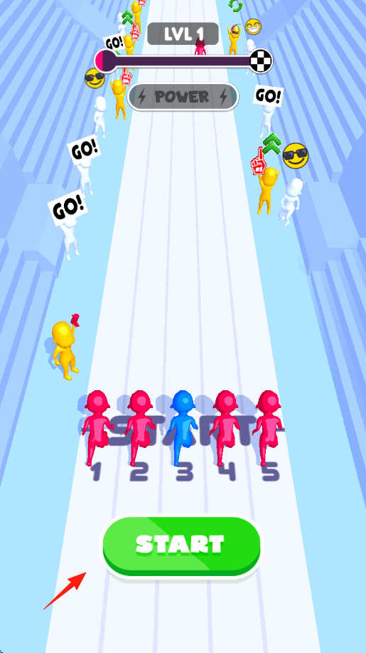 1、开局准备“LVL1”赛道,选蓝色角色,点“START”开跑,赛道两侧有加油人群、“POWER”能量条。