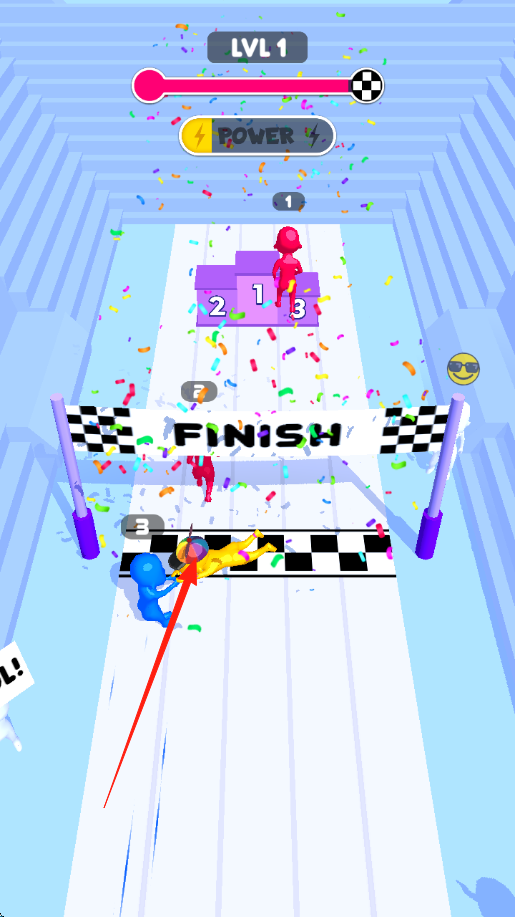 2、竞速对抗在跑道与红黄角色竞争,冲刺终点线(FINISH),冲线后有颁奖台(1/2/3名),图中红角色第1,黄角色摔倒,蓝角色第3。