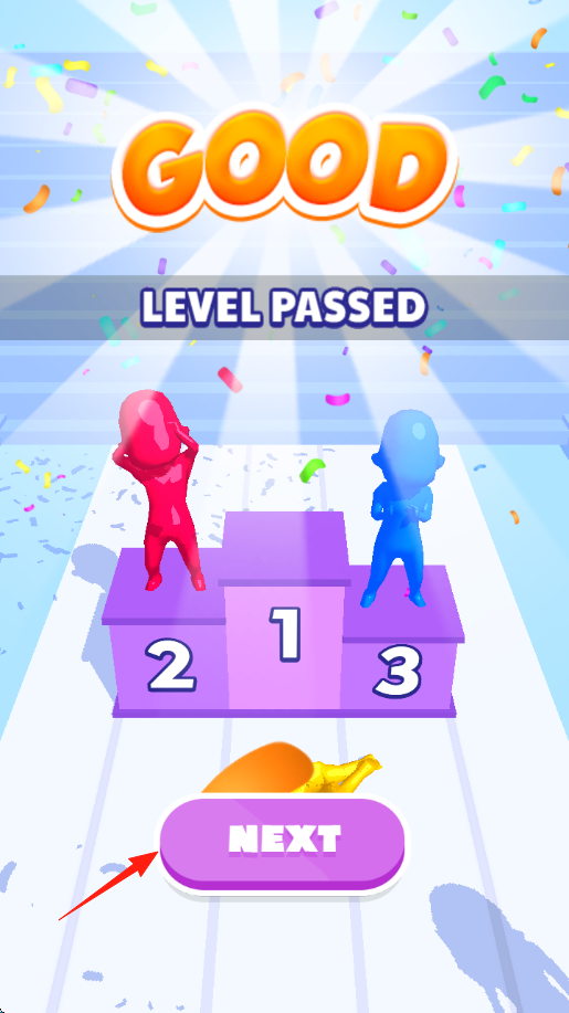 3、胜利结算显示“GOODLEVELPASSED”,蓝角色获第2名(颁奖台2位),点“NEXT”进下一关卡,持续赛跑挑战。