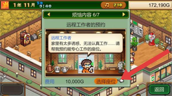 1、呈现“远程工作者的预约”烦恼内容,需为其选择座位,费用10000G,体现游戏中经营餐厅、处理顾客需求的模拟玩法。