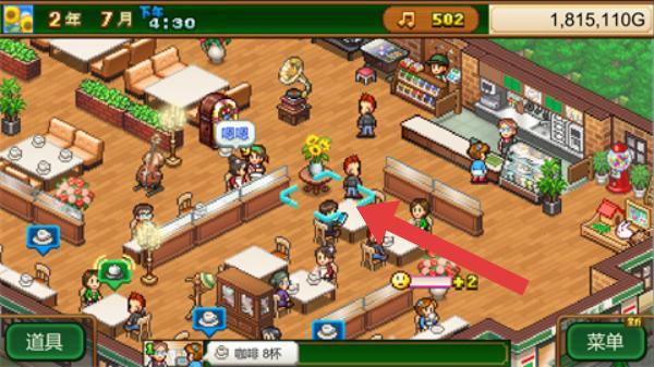 2、呈现咖啡店经营场景,有顾客、员工,显示经营时间(2年7月4:30)、金币(1,815,110G)等信息,体现模拟经营咖啡店、服务顾客的玩法。