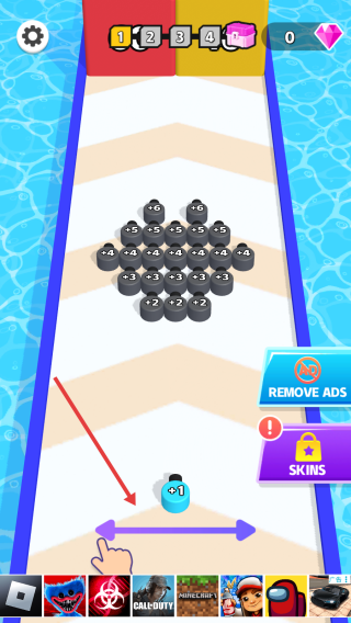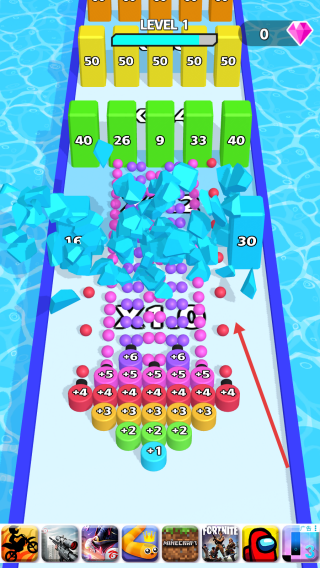 2、撞击彩色方块(带数字),优先撞数字小的,用合成后的大球,快速清路。