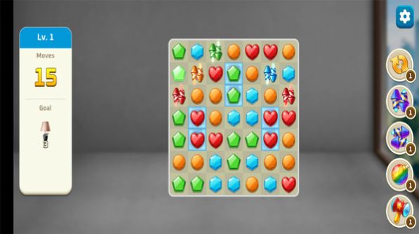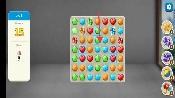 1、在消除关卡(如Lv.1),交换、匹配宝石,完成目标(如收集指定物品),获取金币。