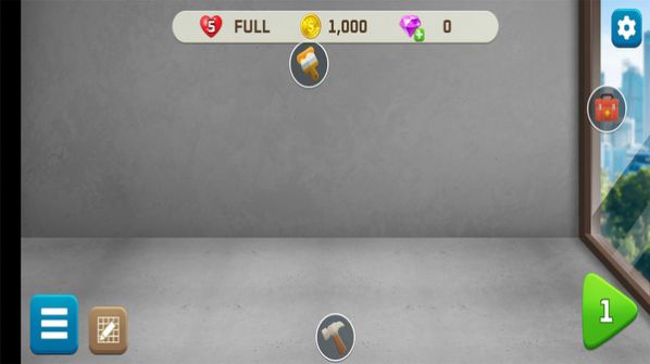 2、用金币(如1,000金币)购买家具、工具,进入房间场景,点击“锤子”等图标,对房间进行装修改造。