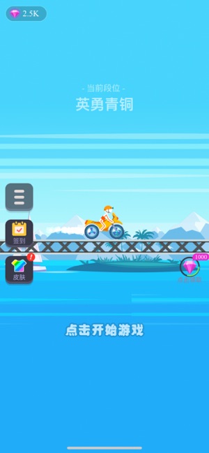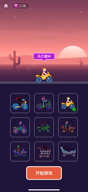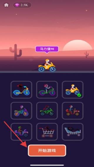 1、选橙色摩托(马力90),点【开始游戏】,进入赛道。
