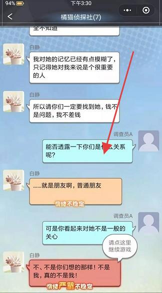 2、在“橘猫侦探社(7)”对话,关注“白静”情绪(不稳定/严重不稳定),提问套取关键信息(如人物关系)。