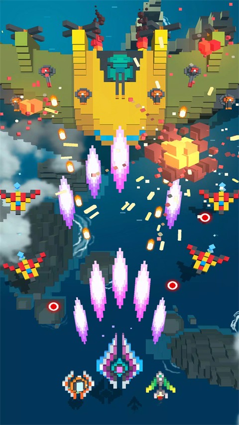 3、像素风格竖屏设计:采用复古像素画面,竖屏界面适配单手操作,简洁画风中融入丰富的弹幕特效与敌机造型,视觉风格独特。