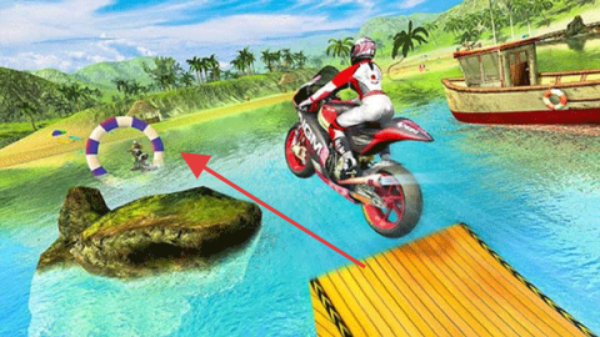3、过跳台(木板/环形)时,提前加速,空中调整姿态,完成特技,赢比赛。