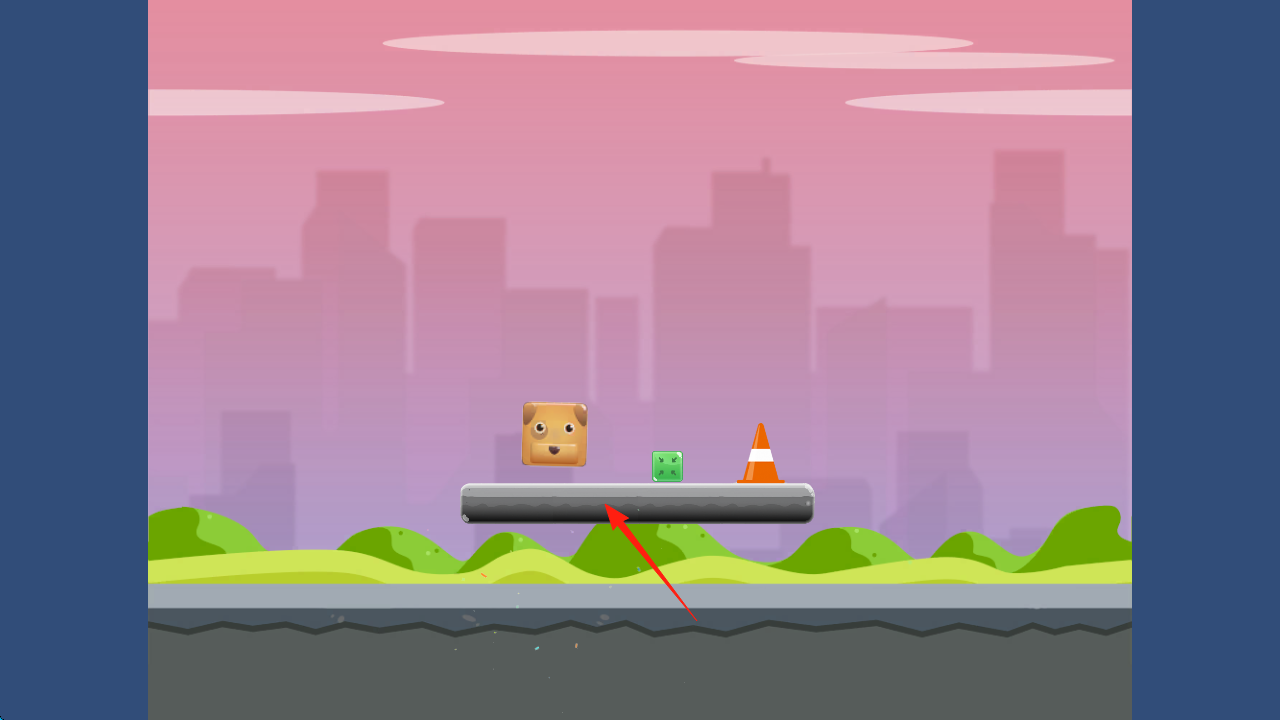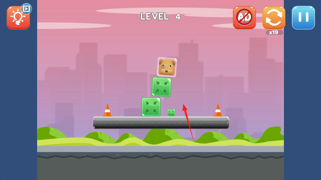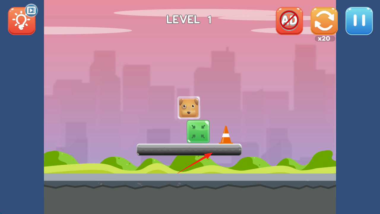 1、进入LEVEL1(红箭头),操控小狗,跳跃绿色方块,利用方块弹性,越过路障(锥形桶),推进关卡。