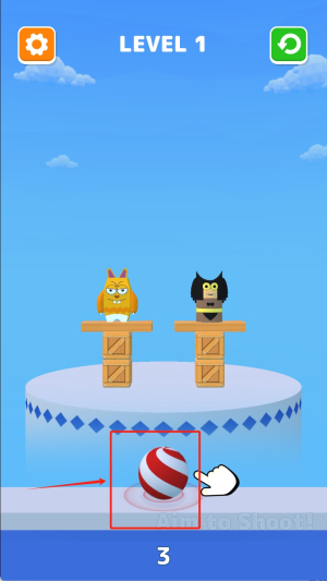 1、第一关开始时,点击并按住红白条纹球,调整角度和力度后松开,将球投向对面木台上的卡通动物完成目标。