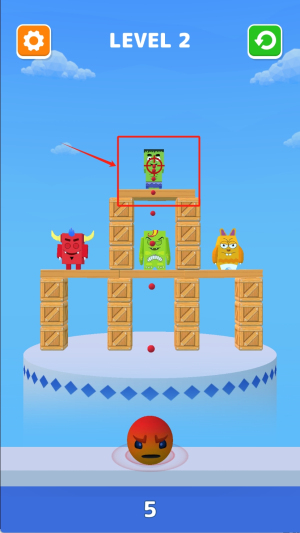 3、第二关需瞄准红框选中的怪物,控制红色球体弹射轨迹,精准撞击目标,同时避开其他障碍物。