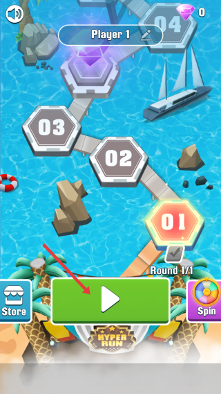 1、关卡选择:在地图界面选“01”等关卡,点击绿色“播放”按钮开始,进入Round1/1。