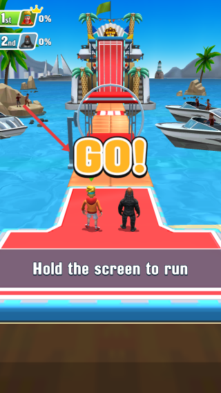 2、赛前准备:在起点按“Hold the screen to run”提示长按蓄力,倒计时后释放,角色(人、猩猩)起跑。