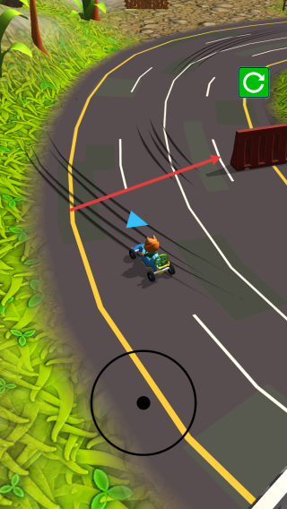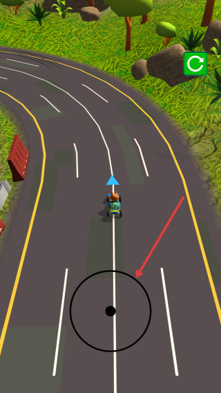2、进入弯道赛道,用虚拟摇杆控蓝色赛车,沿白线行驶,避偏离路线(黑色圈)。