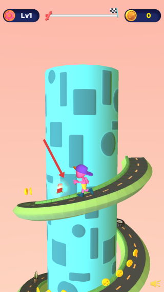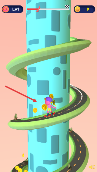 3、关卡推进:完成Lv1赛道,积累金币,解锁新关卡,体验滑板竞速与螺旋赛道挑战乐趣。