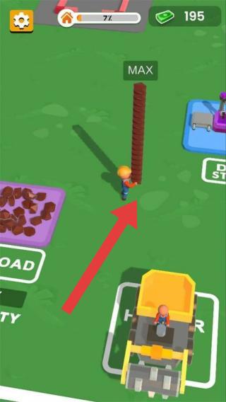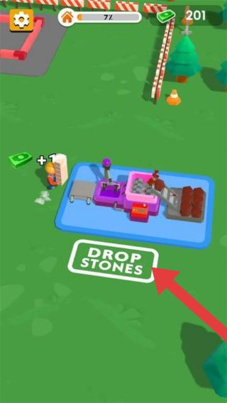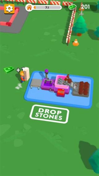 2、玩家操控角色经营工厂,按提示(如“DROPSTONES”投放石料)操作设备,通过资源加工、搬运等推进流程,有建设、生产经营等玩法,能体验从基础操作到工厂发展的乐趣。