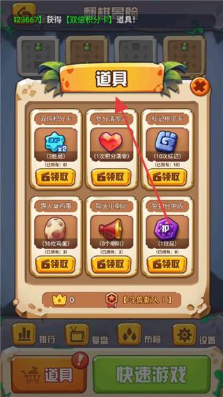 3、“翻棋冒险”模式道具界面,展示“双倍积分卡”“体力清零卡”等道具,可领取使用,助力游戏进程。
