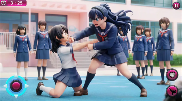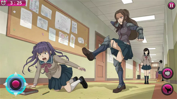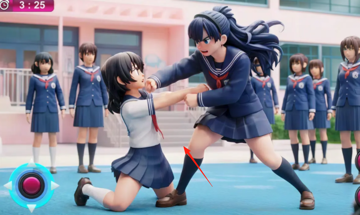 1、进入校园场景(红箭头),操控角色,用左侧摇杆移动,右侧技能(拳头踢击),对抗敌人,推进剧情。