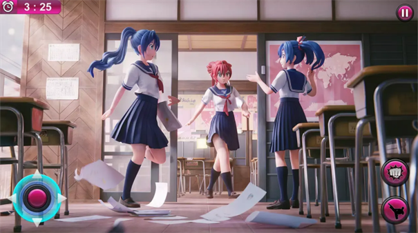 2、在教室区域(红箭头),利用场景(桌椅纸张),干扰对手,触发互动,连招攻击,击败敌方角色。