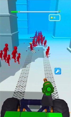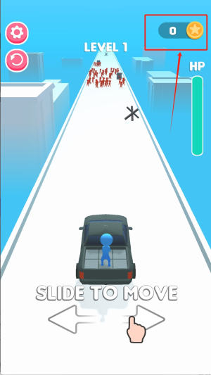 1、游戏初始界面显示"LEVEL 1",滑动屏幕控制战车移动,注意右上角分数和HP生命条,保护车上的蓝色小人避开后方僵尸追击。