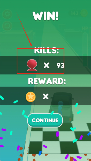 2、完成关卡后进入结算界面,查看"WIN!"提示和击杀数统计(如红框标注的93击杀),点击"CONTINUE"领取奖励并进入下一关。
