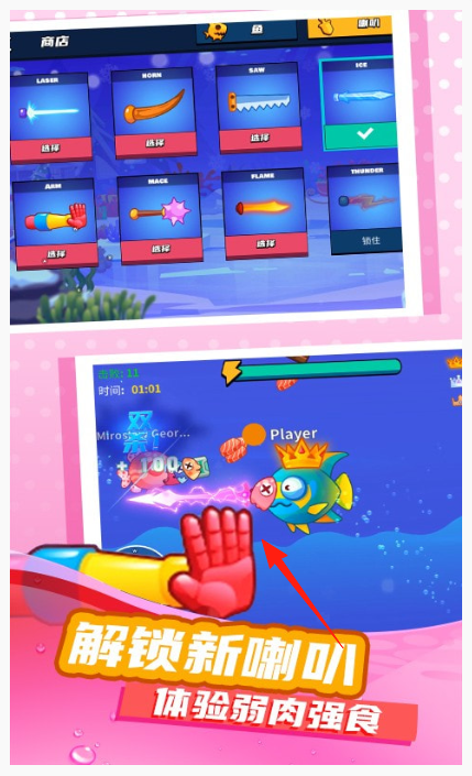 1、进入商店(红箭头),用金币买武器(激光锯刀),装备后,在战斗场景,攻击其他鱼,体验弱肉强食。