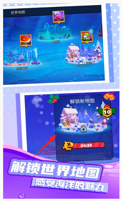 2、解锁新地图(红箭头),完成前置条件(24/25进度),进入“X-MAS海洋”,探索新场景,触发隐藏任务。