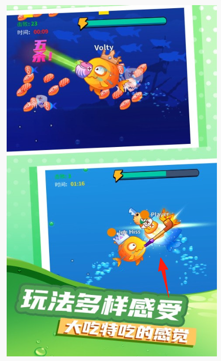 3、参与对战(红箭头),操控角色,吞噬小鱼(五条连击),积累能量,进化成长,解锁多样玩法(武器技能)。
