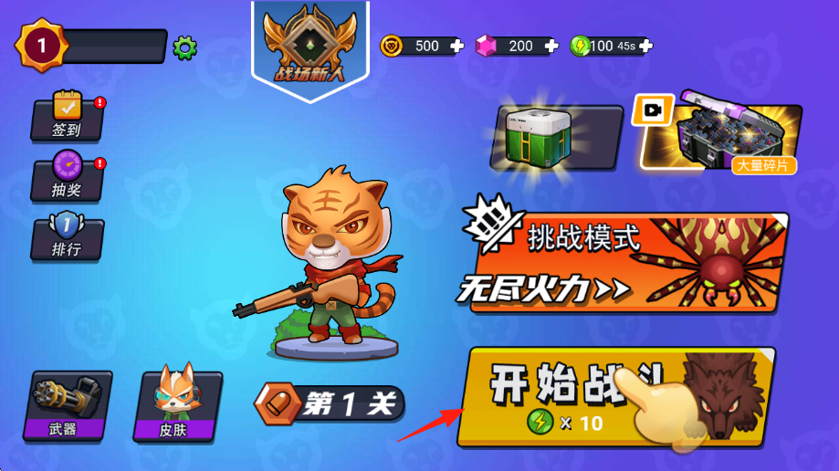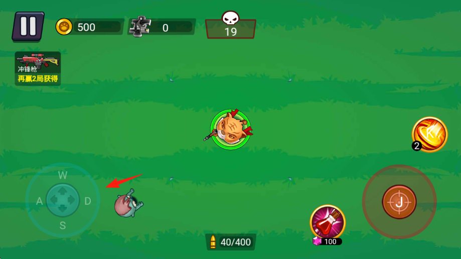 1、点击【开始战斗】(红箭头),进入第1关,用虚拟摇杆(WASD)移动,右侧按钮射击,熟悉操作。