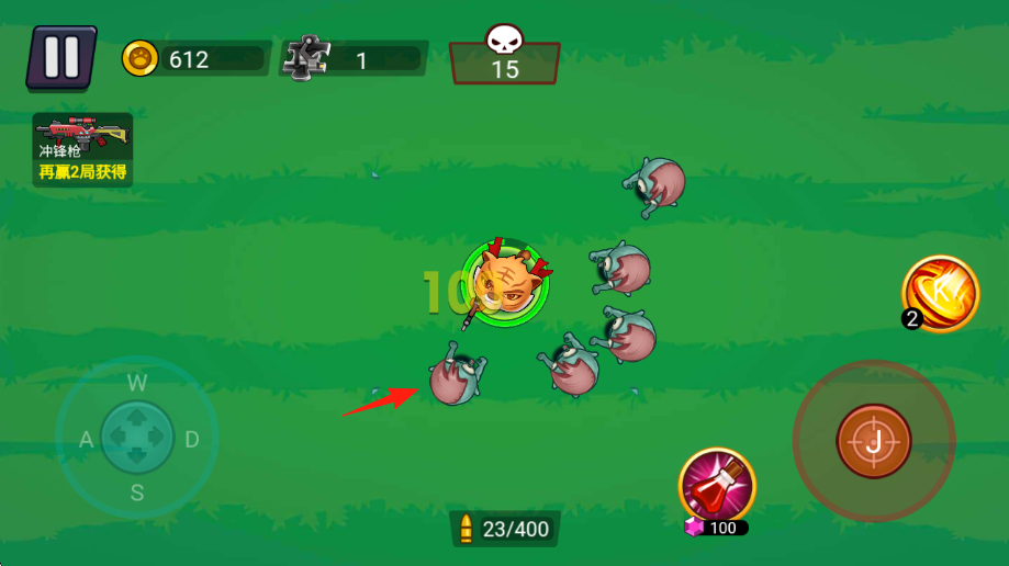 3、被围堵时(红箭头),用技能(K键)清场,拾取金币(612),升级武器,推进关卡,解锁新挑战。