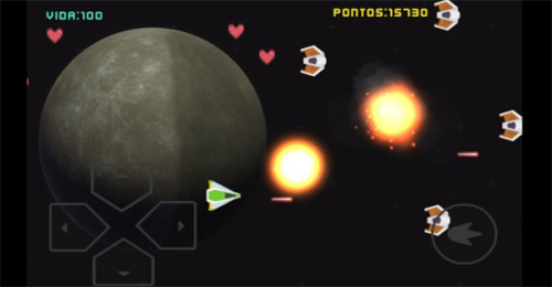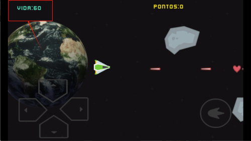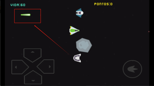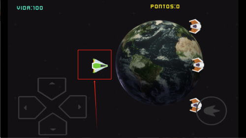 2、观察右上角"PONTOS:0"分数显示,控制飞船躲避红框内长条状攻击物,利用右下角技能键发动反击,逐步提升得分。