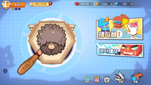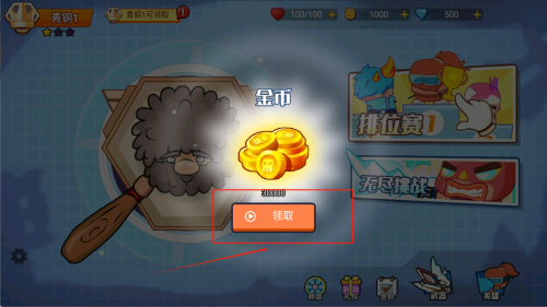 1、在游戏主界面点击红框标注的"领取"按钮,获取青铜1段位奖励,注意查看右上角1000金币和500钻石的当前持有量,为后续升级做准备。