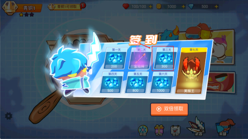 2、进入签到系统界面,查看连续登录奖励内容,点击"双倍领取"按钮获取首日800金币奖励,注意剩余6天的奖励内容及获取条件。