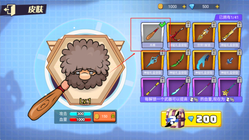3、切换至角色皮肤界面,选中已拥有的1/41款皮肤,查看右侧武器解锁进度,了解每解锁新武器可提升2%血量的加成效果。