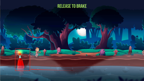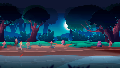 1、操控红框标记的主角在月夜森林中探索,小心穿过墓碑区域,注意地面可能出现的闪光道具,收集它们增强角色能力。