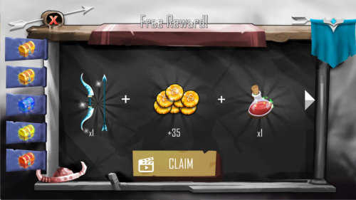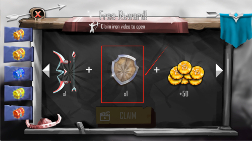 1、在"Free Reward!"界面点击画框选中的盾牌道具,观看视频后点击"CLAIM"按钮领取,获得+50防御加成和x1道具奖励。