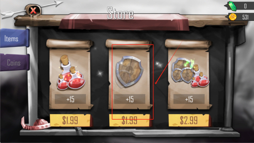 3、在商店"Items"栏目中选购画框标记的$1.99防御盾牌,支付后角色属性+15,增强生存能力应对后续关卡挑战。