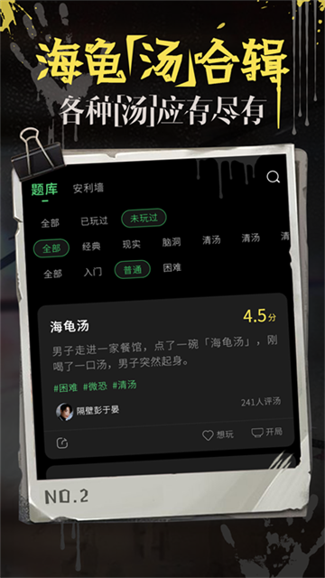 1、题库内容丰富,涵盖剧情、恐怖、烧脑、逻辑、搞笑等多个分类,满足不同人群在聚会中的推理偏好与娱乐需求。