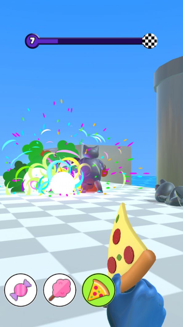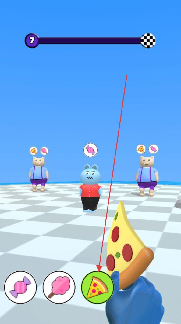2、点击下方对应道具(如披萨、糖果),瞄准需求角色释放,满足需求推进关卡。
