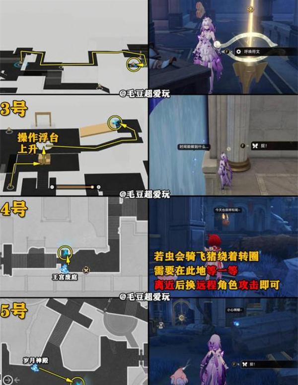3、机制挑战聚焦3-5号点位,强调操作浮台、等待飞猪等场景交互,及切换远程角色攻击的战斗策略。