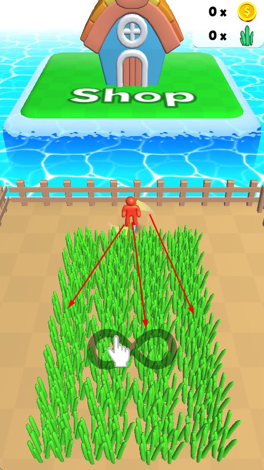 1、操控角色在草地区域,通过划动操作,收割草资源,积累基础物资。