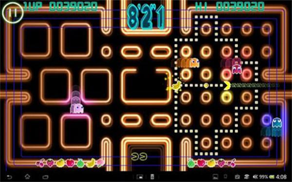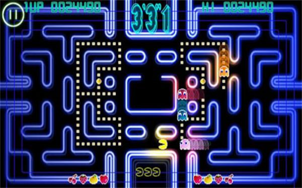2、在迷宫地图,引导吃豆人躲避幽灵,吃掉豆子、水果等道具,获取分数,推进游戏进程。