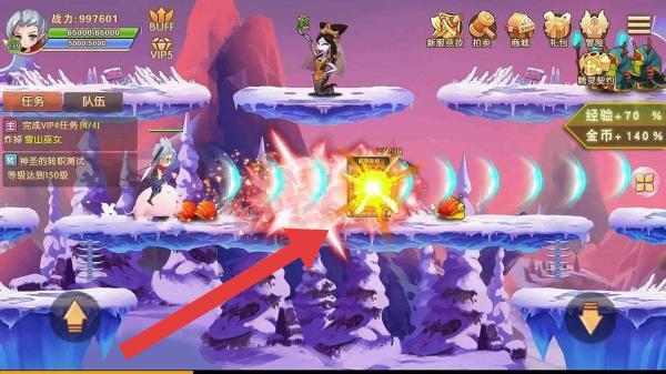 2、在冰雪关卡,操控角色,沿箭头攻击发光目标,获取经验、金币,完成“神器的极致测试”任务。