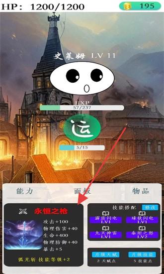 1、角色信息界面,“史莱姆LV11”,显示HP、金币,装备“永恒之枪”及技能等,可查看能力、面板、物品。
