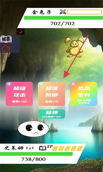 2、战斗养成界面,“金兔子”对手,“史莱姆LV1”可选择“超级攻击”“超级防御”“拟态变身”等操作,还有“凝神”功能。