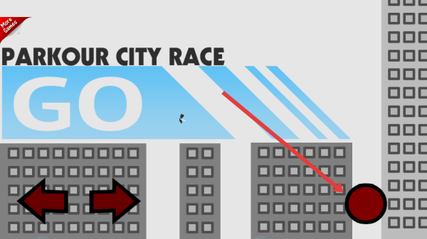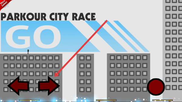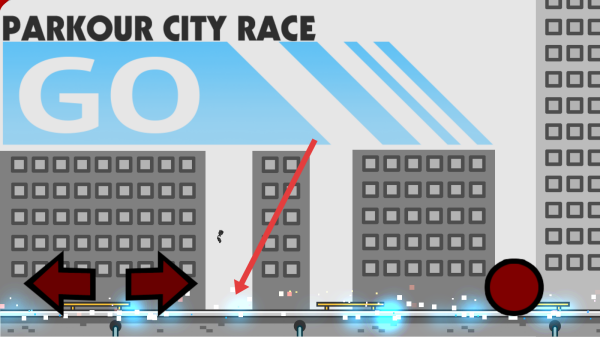 1、点击右侧红色圆形按钮,控制火柴人开始跑酷,利用左右箭头按键,调整移动方向。