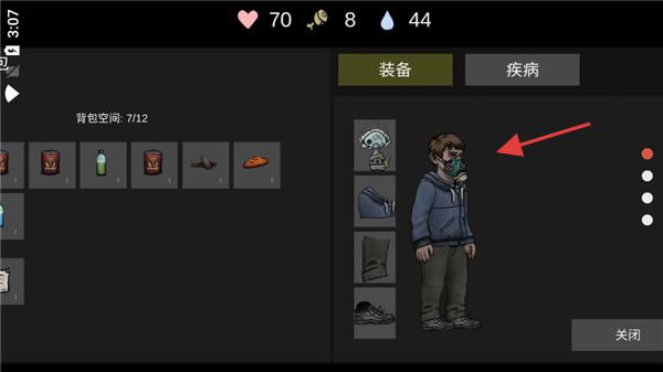 2、点击"New Game"进入游戏,打开背包,你可以看到自己的装备,疾病等等。