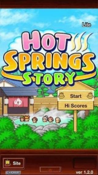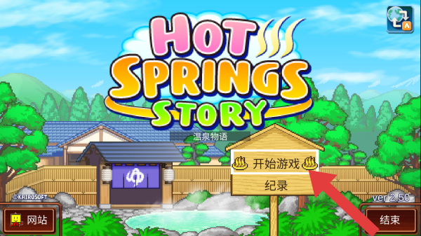 1、英文名称“HOTSPRINGSSTORY”、中文名称“温泉物语”,还有“开始游戏”“纪录”“网站”“结束”等功能按钮,呈现出日式温泉旅馆的背景场景。